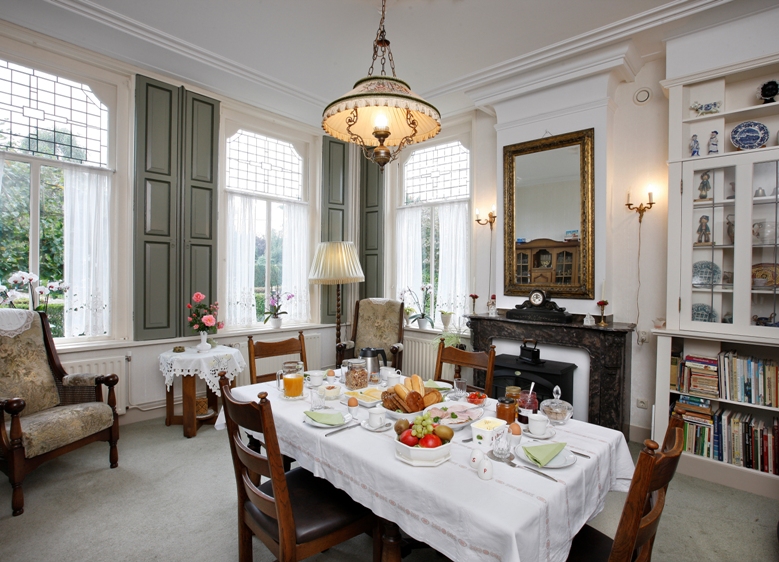 De eetkamer, waar de gasten hun ontbijt gebruiken, bevindt zich op de begane grond in het voorhuis.